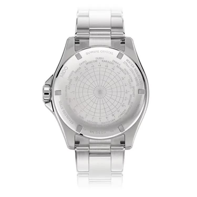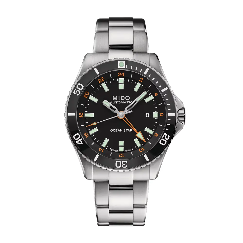 Die Mido Ocean Star GMT vereint sportliche Funktionalität und elegantes Design und eignet sich ideal nicht nur für Reisende. Das robuste runde Gehäuse mit einem Durchmesser von 44 mm besteht aus hochwertigem Edelstahl und wird durch ein robustes Saphirglas geschützt, das für hohe Beständigkeit und perfekte Ablesbarkeit sorgt.