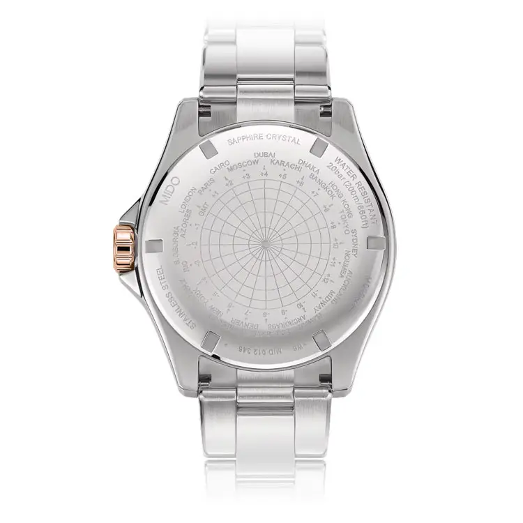 Im Inneren arbeitet das automatische Kaliber Mido 80 (ETA C07.661) mit 80 Stunden Gangreserve. Mit 20 ATM Wasserdichtigkeit und Bicolor-Edelstahlarmband ist die Ocean Star GMT der perfekte Begleiter für Reisen und Alltag.