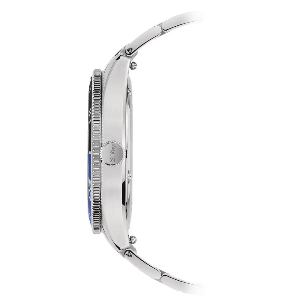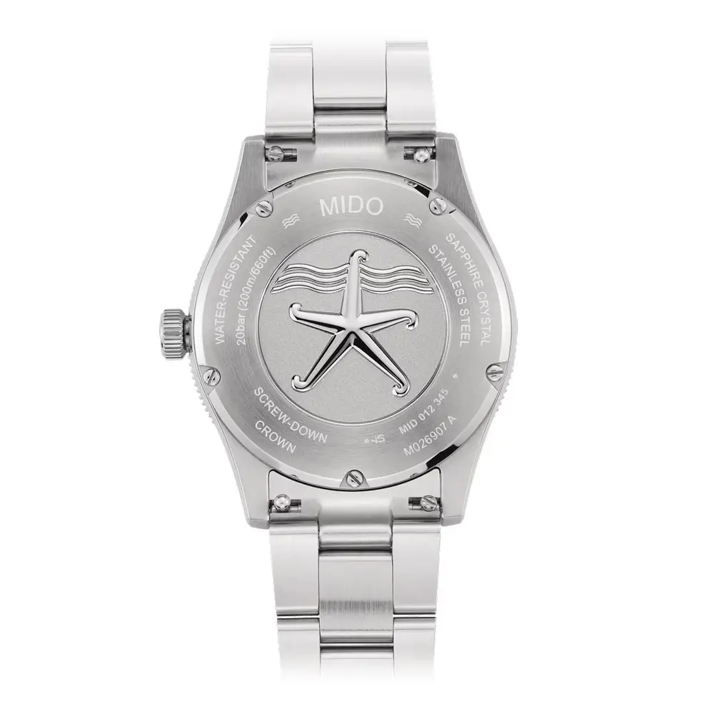 Angetrieben wird das Modell von dem innovativen Automatikkaliber Kaliber 72 (ETA-Entwicklung A31.111) mit einer Gangreserve von bis zu 72 Stunden, das mit einer antimagnetischen Nivachron™-Feder ausgestattet ist, die für langfristige Genauigkeit und Zuverlässigkeit sorgt. Die Wasserdichtigkeit bis 200 m, die verschraubte Krone und der mit einem Seestern geprägte Gehäuseboden spiegeln das Erbe und die Erfahrung von Mido im Bereich der Taucheruhren wider.