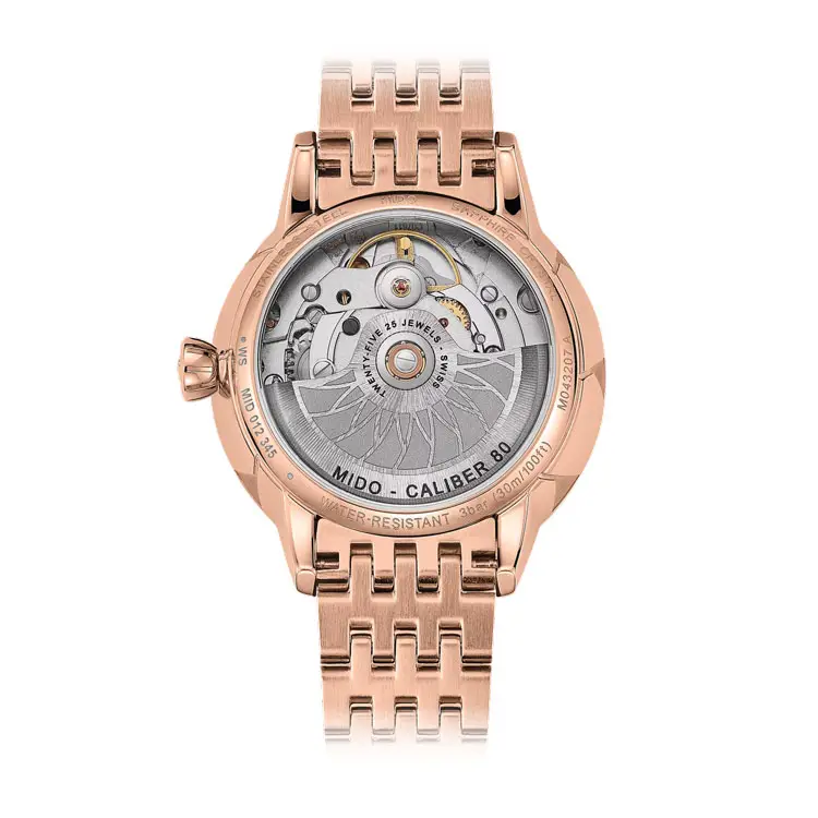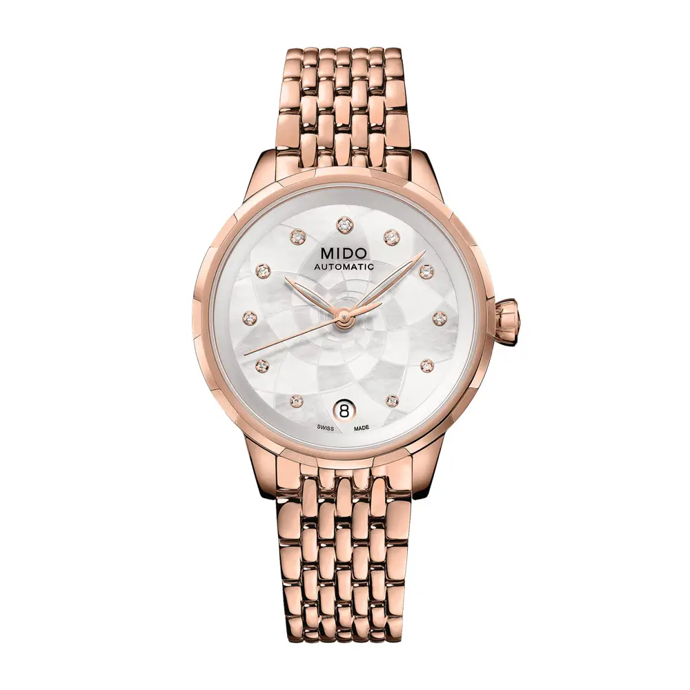 Die Mido Rainflower ist die Verkörperung femininer Eleganz und Zartheit, inspiriert von natürlichen Formen und Details. Das runde Gehäuse mit einem Durchmesser von 34 mm besteht aus hochwertigem Edelstahl mit roségoldfarbener PVD-Beschichtung, was dem Modell einen anspruchsvollen und modernen Look verleiht. Der gleiche bicolor-Stil zeigt sich auch an der Lünette und dem eleganten Edelstahlarmband mit roségoldfarbenen Akzenten, das mit einer komfortablen Faltschließe versehen ist.