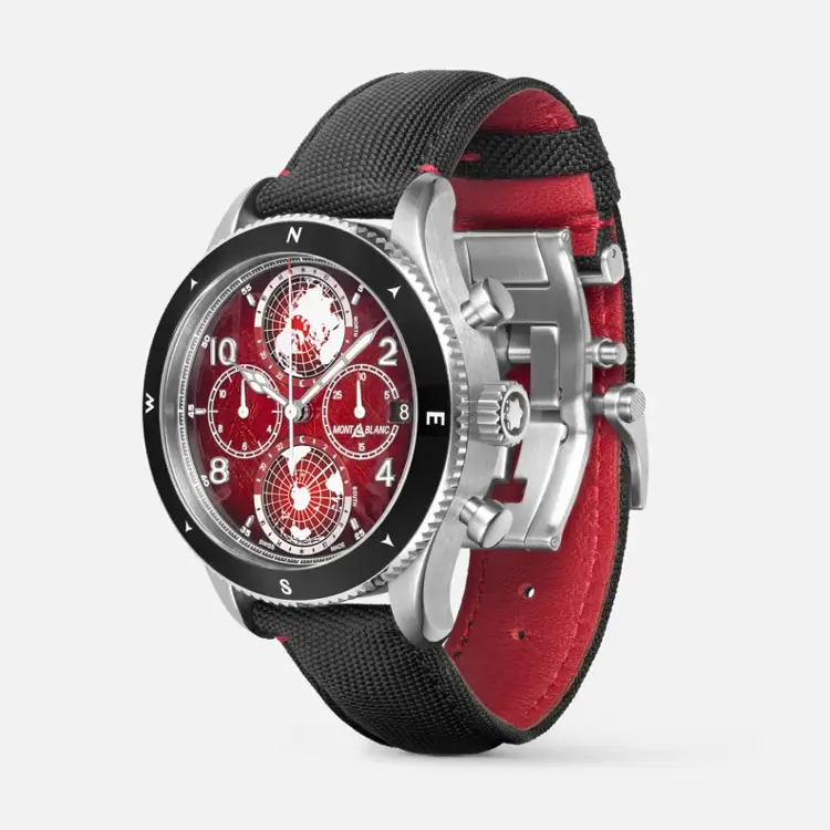 Das 44-mm-Gehäuse aus Titan besticht durch Leichtigkeit und Robustheit, ergänzt durch eine beidseitig drehbare Keramiklünette mit Kompassmarkierungen. Das rote Zifferblatt mit „Cracked Ice“-Struktur erinnert an vereiste Berggipfel und sorgt für eine außergewöhnliche Tiefenwirkung. Unter dem Saphirglas drehen sich zwei Halbkugeln, die die Weltzeit anzeigen, während die Chronographenfunktion den sportlichen Charakter betont.