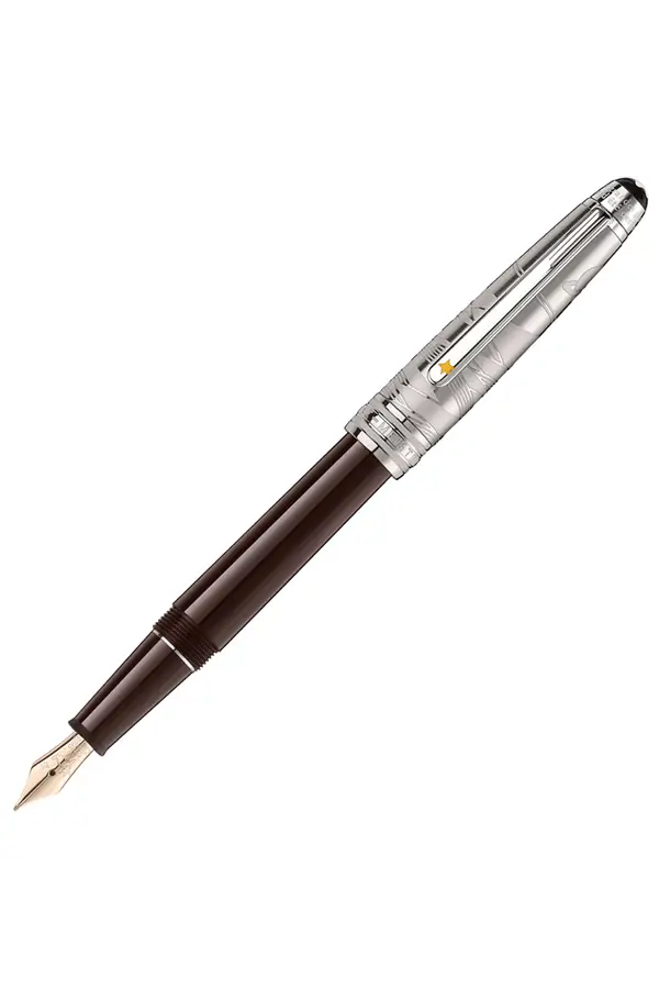 Das Gehäuse aus braunem Edelharz erinnert an die Wüste und die Farben der Erde. Die platinbeschichtete Kappe, fein graviert mit Sanddünen und dem Flugzeug des Piloten, erzählt die Geschichte einer besonderen Begegnung. Der platinbeschichtete Clip mit gelbem lackiertem Stern symbolisiert Hoffnung und das Streben nach den Sternen.