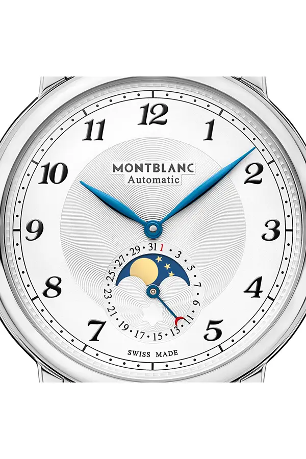 Die Montblanc Star Legacy Moonphase 117578 ist ein elegantes Modell aus der Star-Legacy-Kollektion, das klassische Ästhetik mit feinen Komplikationen der traditionellen Uhrmacherkunst vereint. Das runde Gehäuse mit 42 mm Durchmesser besteht aus Edelstahl und wird durch ein saphirbeschichtetes Glas geschützt, das eine hervorragende Ablesbarkeit und Kratzfestigkeit bietet.