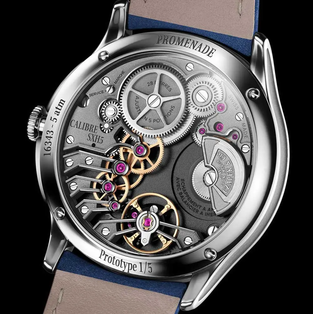 Das mechanische Herzstück bildet das Manufakturkaliber SXH5 mit automatischem Aufzug, einer Frequenz von 28.800 Halbschwingungen pro Stunde (4 Hz) und einer Gangreserve von 60 Stunden. Das Werk zeigt sich durch den transparenten Gehäuseboden und offenbart moderne Brückenarchitektur und feine Handdekorationen, die der Tradition der Haute Horlogerie gerecht werden.