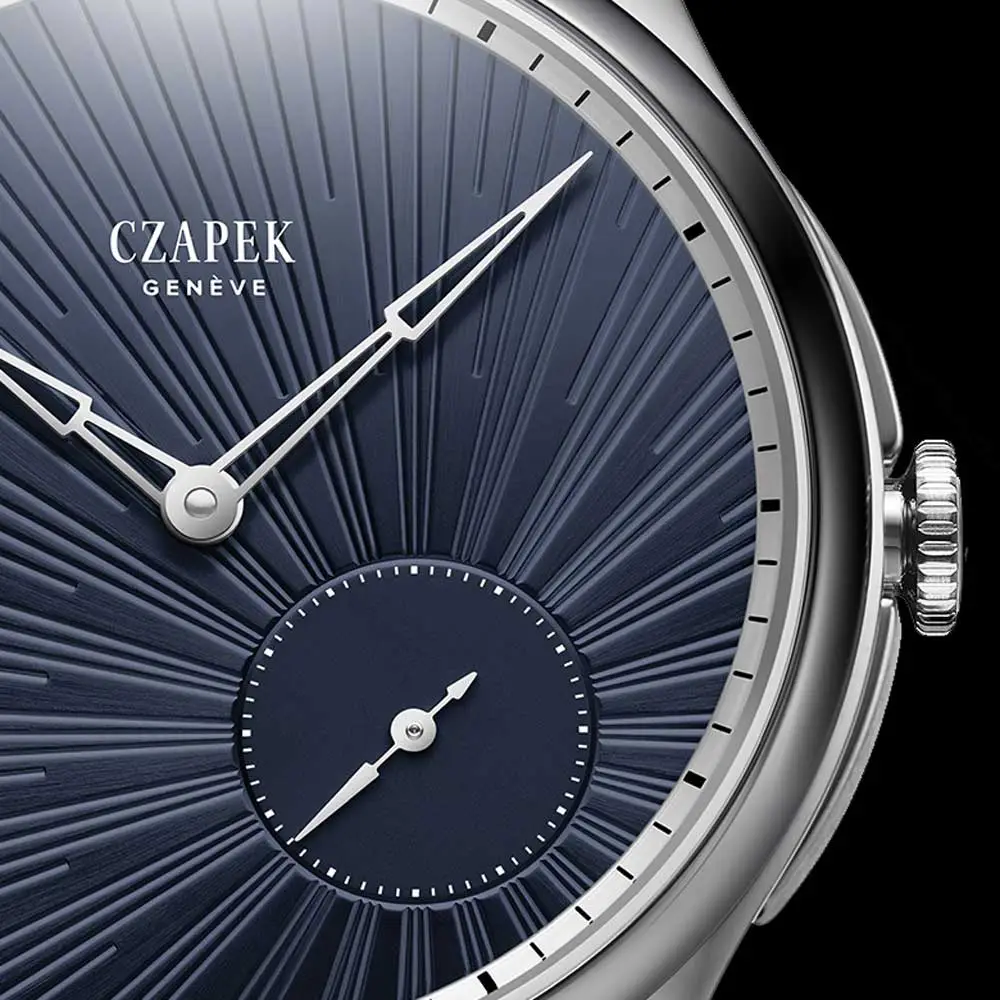 Czapek & Cie konzipierte das Modell Promenade Guilloché Soleil Bleu Nuit als Ode an urbane Abendstunden, in denen der tiefblaue Himmel im Glanz von Buntglasfenstern und fließenden Flüssen reflektiert wird.