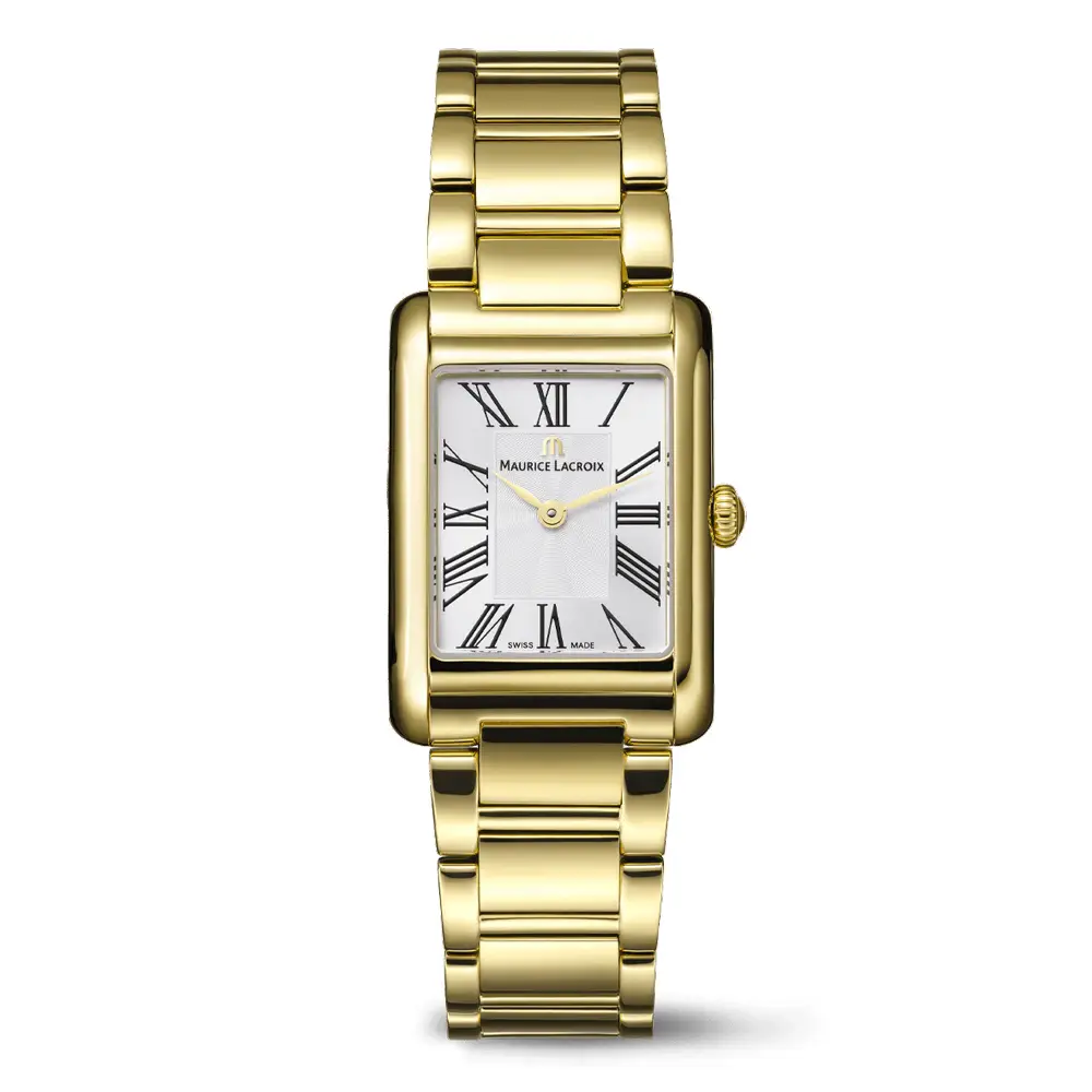 Die Damenuhr Maurice Lacroix Fiaba Square FA1205-PVY02-110-1 vereint klassisches Schweizer Design mit moderner, femininer Eleganz. Das quadratische Gehäuse mit den Maßen 24 × 34 mm wirkt zart und stilvoll, während die PVD-Beschichtung in Gelbgold dem Modell eine luxuriöse Ausstrahlung für den Alltag wie auch für besondere Anlässe verleiht.