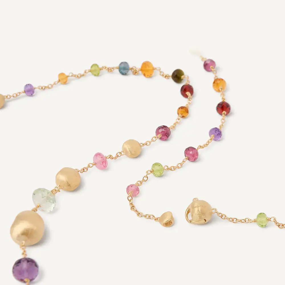 Die Kette ist mit natürlichen Halbedelsteinen in bunter Farbvielfalt besetzt, die im Rosenschliff (routový) geschliffen sind, um ihren Glanz und ihre Tiefe hervorzuheben. Die Kombination von Gold und den leuchtenden Farben der Edelsteine schafft ein harmonisches, lebendiges Gesamtbild. Jeder Stein wird sorgfältig von Hand gefasst und macht jedes Stück zu einem Unikat.