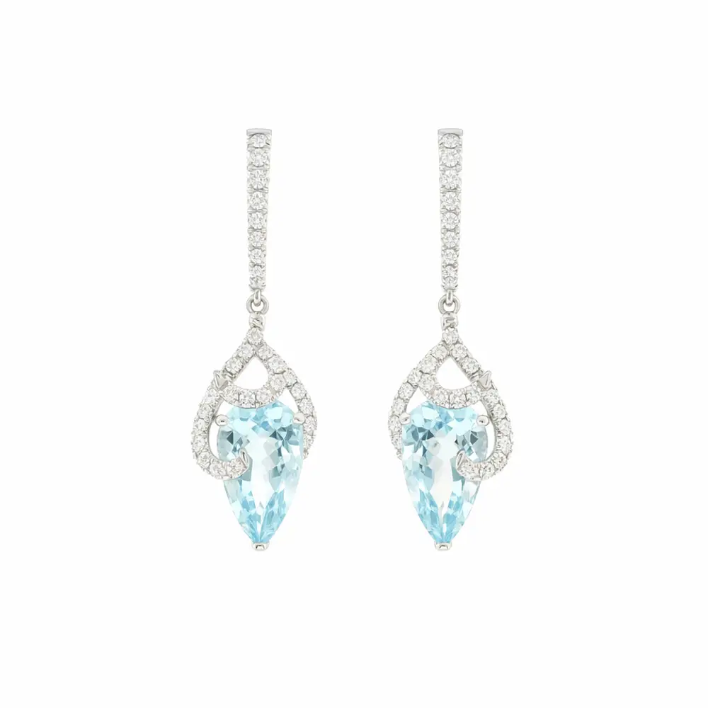Die Ohrringe sind aus Weißgold gefertigt, das perfekt mit den kühlen Farbtönen der Aquamarine und Diamanten harmoniert. Die präzise Verarbeitung und hochwertige Fassung sorgen für eine ansprechende Optik sowie angenehmen und sicheren Tragekomfort. Das hängende Design verleiht dem Schmuckstück Leichtigkeit und Eleganz bei jeder Bewegung.