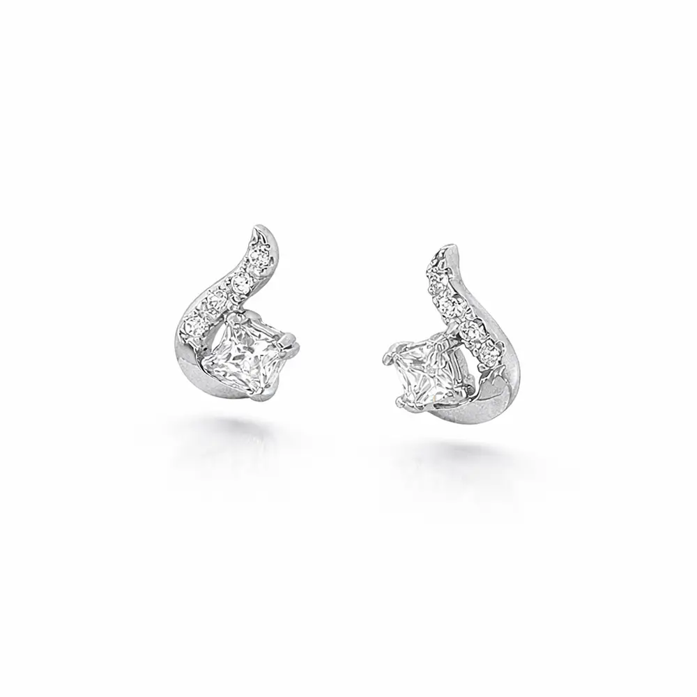 Diese goldenen Ohrstecker mit elegant geformtem Motiv und Zirkonia überzeugen durch ein modernes Design mit sanft dynamischer Linienführung. Im Mittelpunkt steht ein quadratisch geschliffener Zirkonia, der dezent von kleineren Zirkonia umgeben ist, die in eine weich geschwungene Linie eingefasst sind. Das Gesamtbild wirkt leicht, raffiniert und zugleich ausdrucksstark.