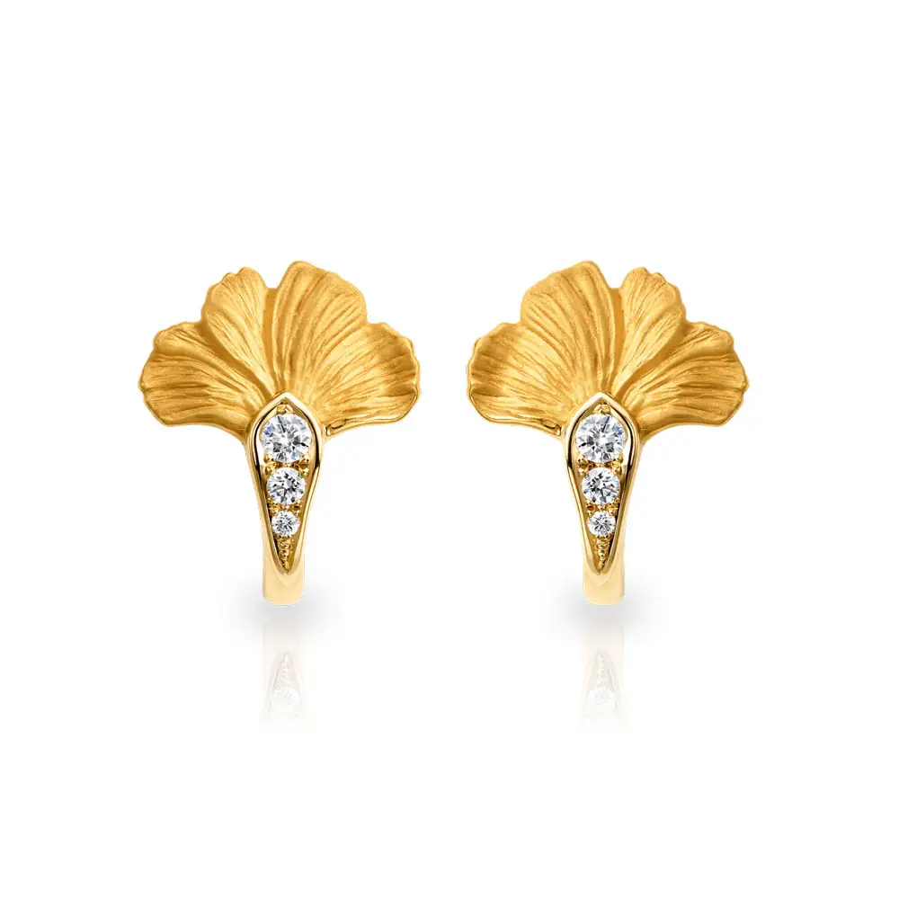 Das Zentrum der Ohrringe zieren sechs kleine Diamanten mit einem Gesamtgewicht von 0,11 ct, die in den spitz zulaufenden Teil des Blattes gefasst sind - ein subtiles Element, das den Schmuck zum Funkeln bringt, ohne seine natürliche Fassung zu stören. Das Miniaturdesign ist ideal für das tägliche Tragen und als elegantes Accessoire für den Abend.