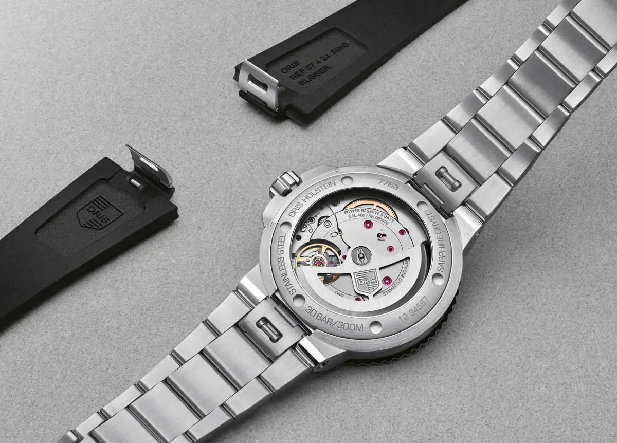 Im Inneren arbeitet das hauseigene Oris Kaliber 400 mit einer Gangreserve von 120 Stunden (5 Tagen), hoher Magnetresistenz und verlängerten Wartungsintervallen. Das Datumsfenster bei 6 Uhr verleiht dem Design Ausgewogenheit, während der sichtbare Gehäuseboden den fein dekorierten Mechanismus zeigt.