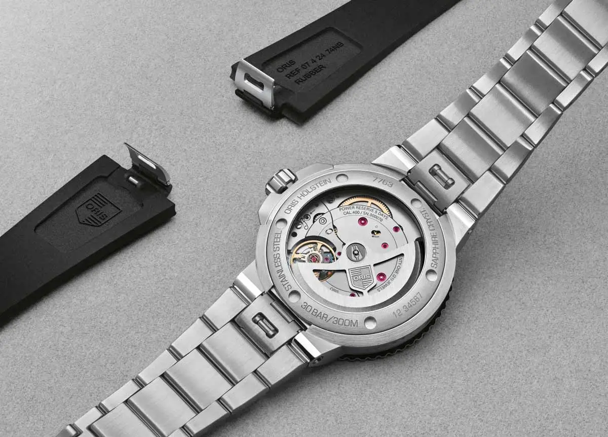 Im Inneren arbeitet das herausragende Manufakturkaliber Oris 400 mit einer Gangreserve von 120 Stunden (5 Tagen), erhöhter Magnetresistenz und verlängerten Serviceintervallen. Das Datumsfenster bei 6 Uhr fügt sich harmonisch ins Design ein, während der durchsichtige Gehäuseboden die feine Veredelung des Werks zeigt.
