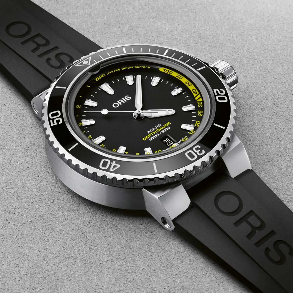 Das schwarze Zifferblatt ist mit gelben Tiefenmesser-Markierungen sowie leuchtenden Zeigern und Indizes versehen, um auch in dunklen Umgebungen eine perfekte Ablesbarkeit zu gewährleisten. Im Inneren arbeitet das automatische Oris Kaliber 733 (Basis SW 200-1) mit 38 Stunden Gangreserve und Datumsanzeige bei 6 Uhr. Mit einer Wasserdichtigkeit von 500 Metern (50 bar) ist diese Uhr für den professionellen Taucheinsatz konzipiert.