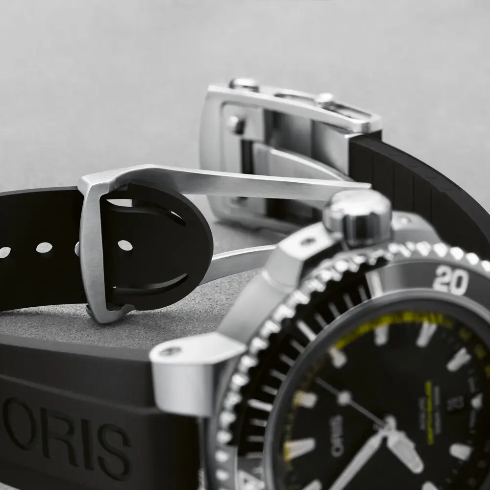 Der schwarze Kautschukarmband mit Sicherheitsfaltschließe und Verlängerungssystem ermöglicht das Tragen über dem Neoprenanzug. Die Oris Aquis Depth Gauge vereint Schweizer Präzision, technische Innovation und kompromisslose Zuverlässigkeit – ein echtes Werkzeug für professionelle Taucher.