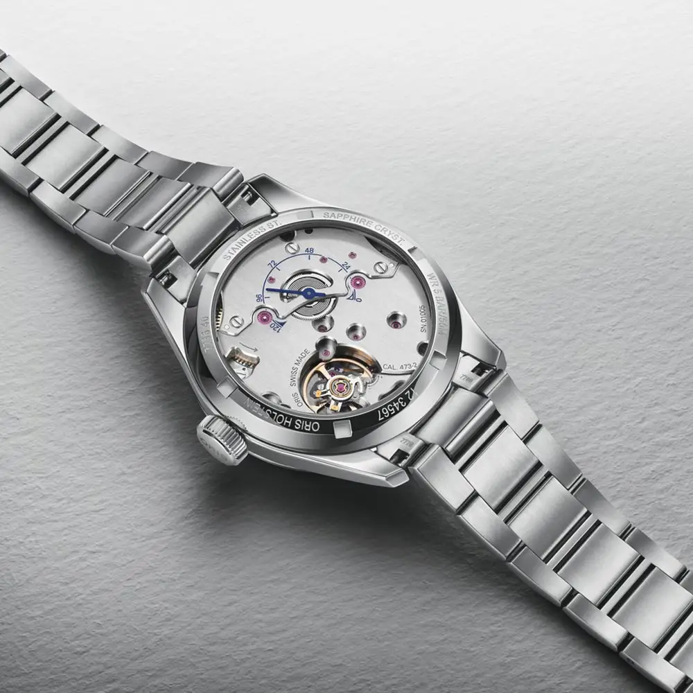 Im Inneren arbeitet das Manufakturkaliber Oris 473 mit Handaufzug und einer verlängerten Gangreserve von 120 Stunden (5 Tage). Es läuft mit 28.800 A/h (4 Hz) und verfügt über eine Gangreserveanzeige auf der Rückseite. Die Konstruktion ist auf Langlebigkeit ausgelegt und wird durch eine 10-jährige Garantie unterstützt.