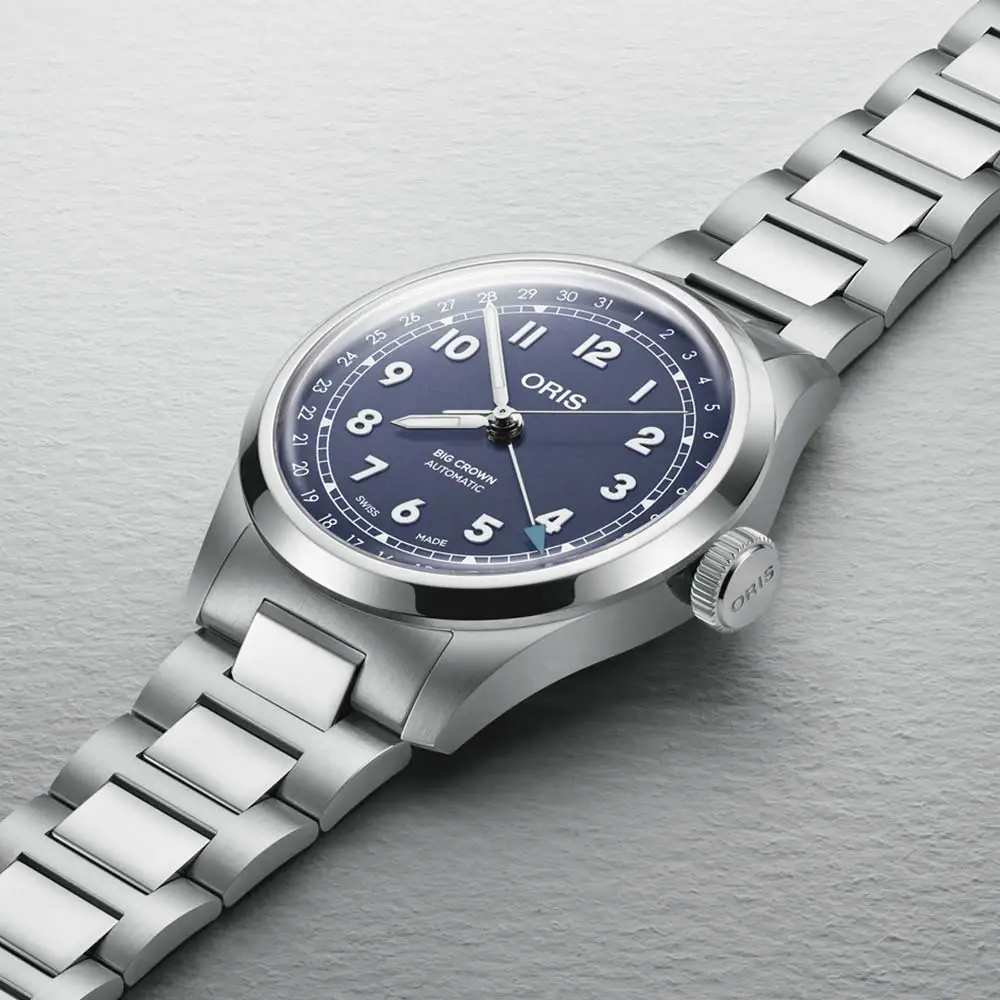 Die Big Crown-Uhren vereinen die Ästhetik der Vergangenheit mit moderner Technik: abgerundetes Saphirglas, arabische Ziffern, eine markante Minutenskala und die typische Zeiger-Datumsfunktion - ein Zeiger, der das Datum am Rand des Zifferblatts anzeigt. Die Modelle sind in verschiedenen Grössen erhältlich, mit Automatikwerken, darunter das hauseigene Kaliber Oris 403 mit antimagnetischen Eigenschaften und einer Gangreserve von 5 Tagen.