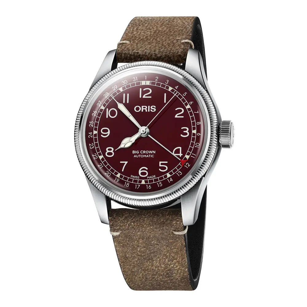 Die Oris Big Crown Pointer Date 01-754-7741-4068-07 5 20 50 ist eine mechanische Herrenuhr, inspiriert vom ikonischen Pilotendesign, das die Big Crown Kollektion seit 1938 prägt. Das Gehäuse mit einem Durchmesser von 40 mm besteht aus Edelstahl und ist mit der charakteristischen großen Krone ausgestattet, die auch mit Handschuhen leicht zu bedienen ist. Besonders auffällig ist das bordeauxfarbene Zifferblatt mit arabischen Ziffern und Leuchtzeigern, das eine hervorragende Ablesbarkeit gewährleistet.