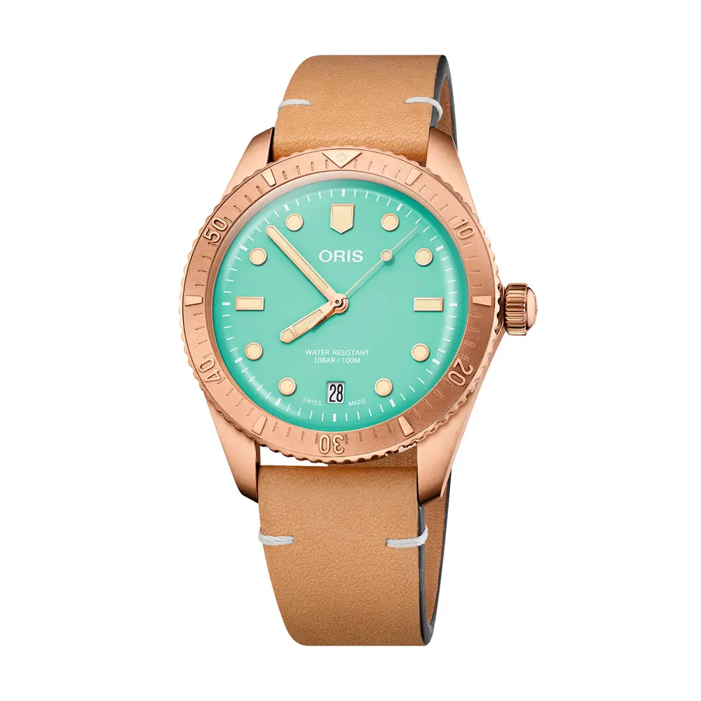 Mit einer Wasserdichtigkeit bis 100 Meter (10 bar) und einem braunen Lederarmband ist die Oris Divers Sixty-Five eine Hommage an das goldene Zeitalter der Taucheruhren – eine perfekte Verbindung aus Retro-Stil, moderner Zuverlässigkeit und Schweizer Uhrmacherkunst.