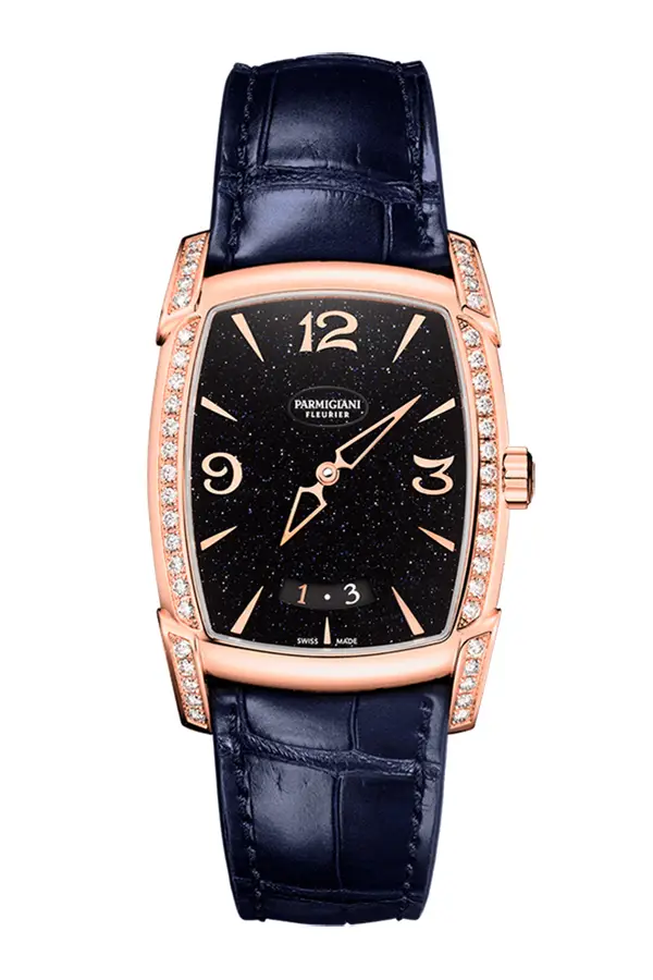 Das charakteristische tonnenförmige Gehäuse mit den Maßen 37,5 × 31,2 mm besteht aus edlem 18-karätigem Roségold und wird durch eine mit Diamanten besetzte Roségoldlünette veredelt, die für exklusiven Glanz sorgt. Ein robustes Saphirglas schützt das elegante blaue analoge Zifferblatt, das durch seine intensive Farbe und feine Verarbeitung besticht.