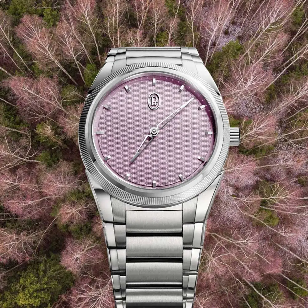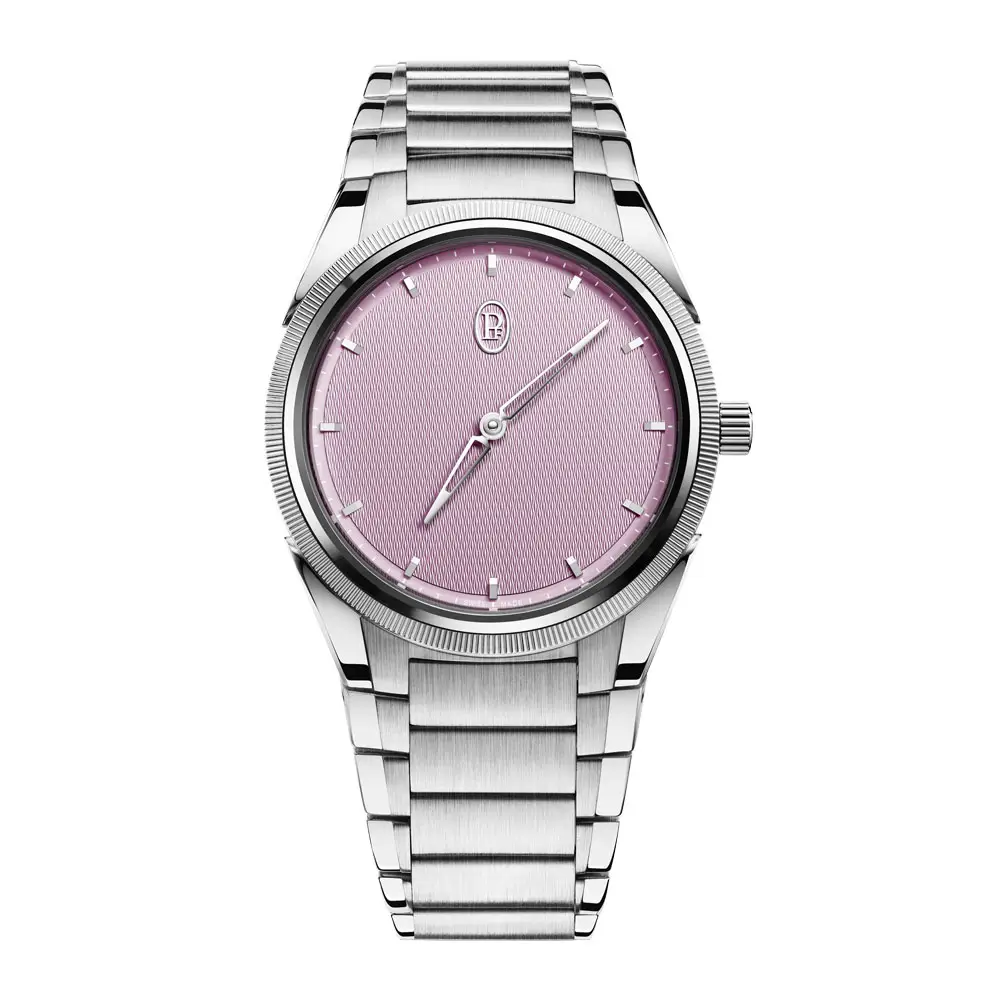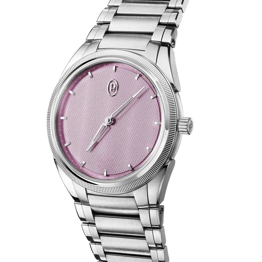 Die Parmigiani Fleurier Tonda PF Automatic Steel Platinum Alta Rosa verbindet sportliche Eleganz mit harmonischen Proportionen und feiner Farbgebung. Das Gehäuse aus Edelstahl mit Lünette aus 950er Platin misst 36 mm bei 8,6 mm Höhe und bietet 100 m Wasserdichtigkeit. Das Alta Rosa Zifferblatt mit handguillochiertem Grain d’Orge-Muster und 18k Goldindizes wirkt dezent und elegant.