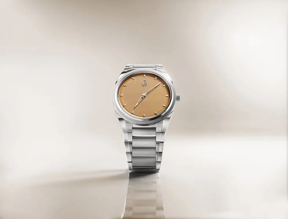 Die Parmigiani Tonda PF Micro-Rotor No Date verbindet raffinierte Ästhetik mit technischer Präzision. Ihr 40-mm-Gehäuse aus Edelstahl wird durch eine Lünette aus massivem 950er Platin ergänzt, die den Kontrast zwischen polierten und satinierten Oberflächen betont. Das Zifferblatt im Farbton Golden Siena ist mit einem zarten guillochierten Grain d'Orge-Muster verziert, während die deltaförmigen Zeiger und die Indexe aus 18-karätigem Weißgold für einen raffinierten Look ohne ablenkende Elemente sorgen.