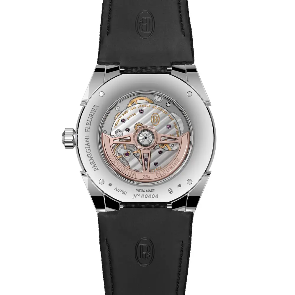 Im Inneren arbeitet das hauseigene Kaliber PF770 mit automatischem Aufzug, einer Gangreserve von 60 Stunden und einem Rotor aus 22 Karat Roségold, der durch ein transparentes Saphirzifferblatt sichtbar ist. Das Kaliber ist mit traditionellen Uhrmachertechniken dekoriert und bietet hohe Präzision und ästhetischen Wert.