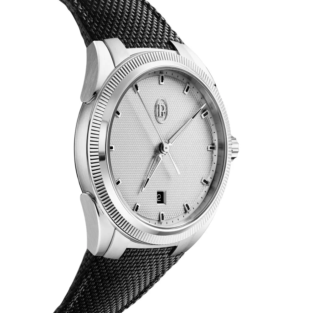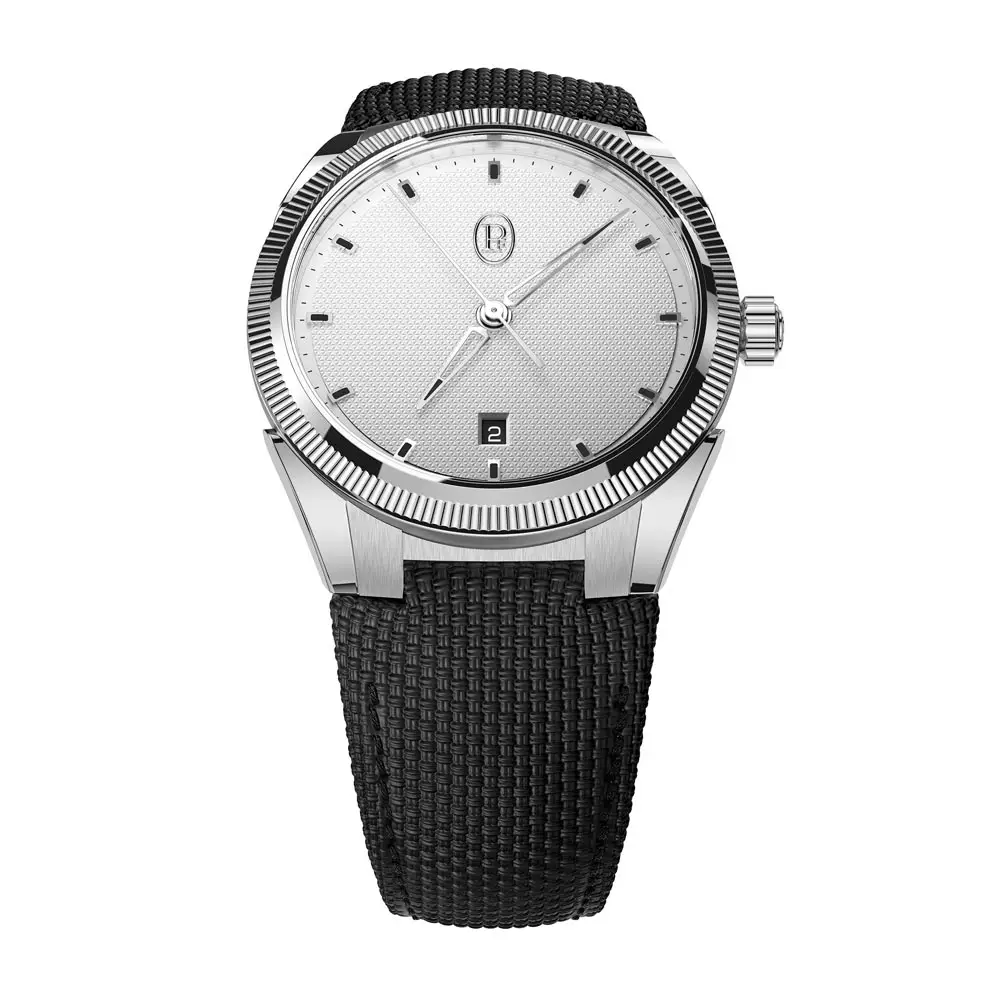 Die Parmigiani Tonda PF Sport Automatic vereint sportliche Dynamik und Luxus. Das 41-mm-Stahlgehäuse ist mit einer fein gefrästen Lünette und einem raffinierten silbernen Zifferblatt mit Guillochierung verziert, das mit Leuchtindizes und deltaförmigen Zeigern für hervorragende Ablesbarkeit sorgt.