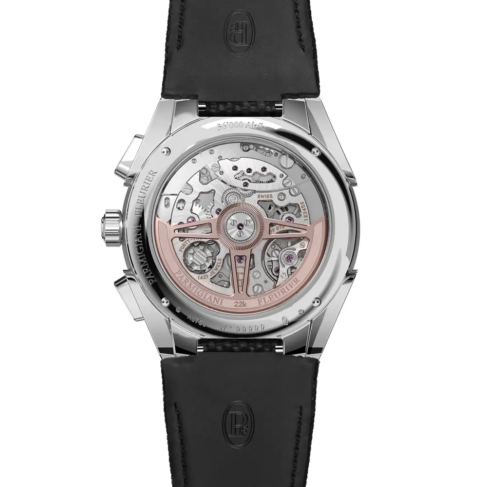 Im Inneren der Uhr arbeitet das hauseigene Automatikkaliber PF070 mit einer hohen Frequenz von 5 Hz, COSC-Zertifizierung und einer Gangreserve von 65 Stunden. Der Chronograph ist präzise, zuverlässig und zudem wunderschön verziert, was man durch das transparente Saphirglasgehäuse bewundern kann.