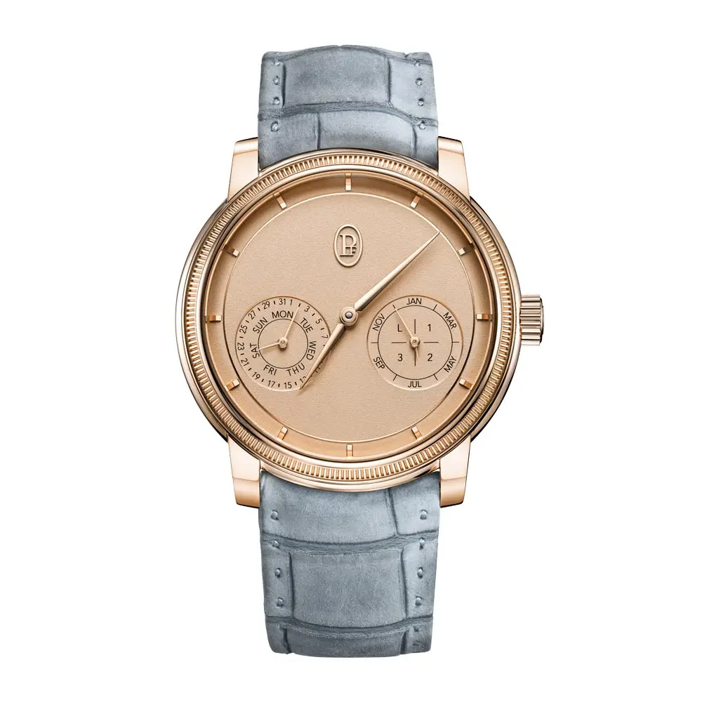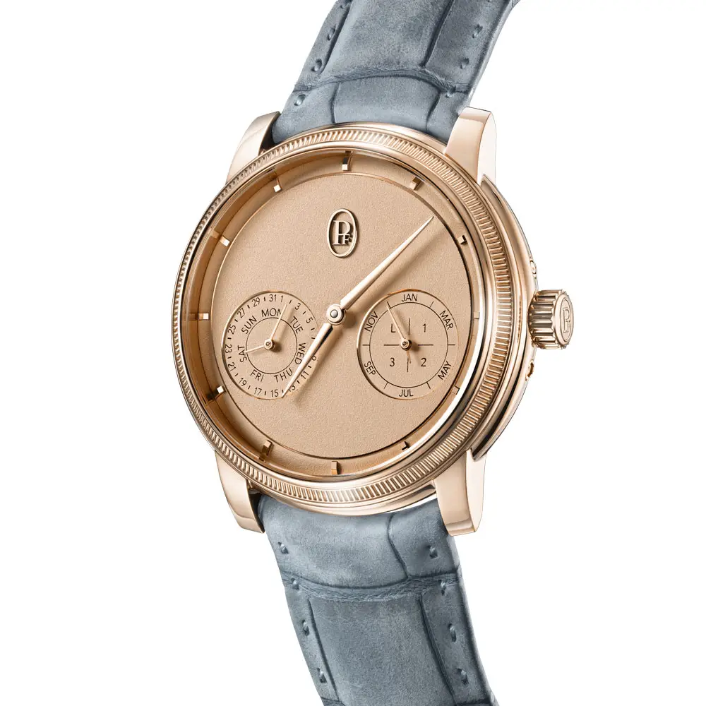 Im Inneren schlägt das hauseigene Kaliber PF733 mit Handaufzug, bestehend aus 265 Bauteilen und 29 Rubinen. Mit einer Frequenz von 4 Hz bietet es eine Gangreserve von 60 Stunden. Der ewige Kalender zeigt Datum, Wochentag, Monat und Schaltjahr auf zwei Hilfszifferblättern bei 4 und 8 Uhr – für Ausgewogenheit und optimale Ablesbarkeit.