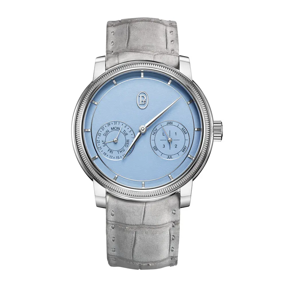 Die Parmigiani Toric Quantième Perpétuel “Morning Blue” (PFH952-2010002-300181) ist eine luxuriöse Dress-Uhr, die den ewigen Kalender mit zeitloser Eleganz verbindet. Das 950-Platingehäuse mit der charakteristischen Toric-Lünette wird von einem handgekörnten Zifferblatt im Farbton „Morning Blue“ ergänzt, das Tiefe und Raffinesse unterstreicht.