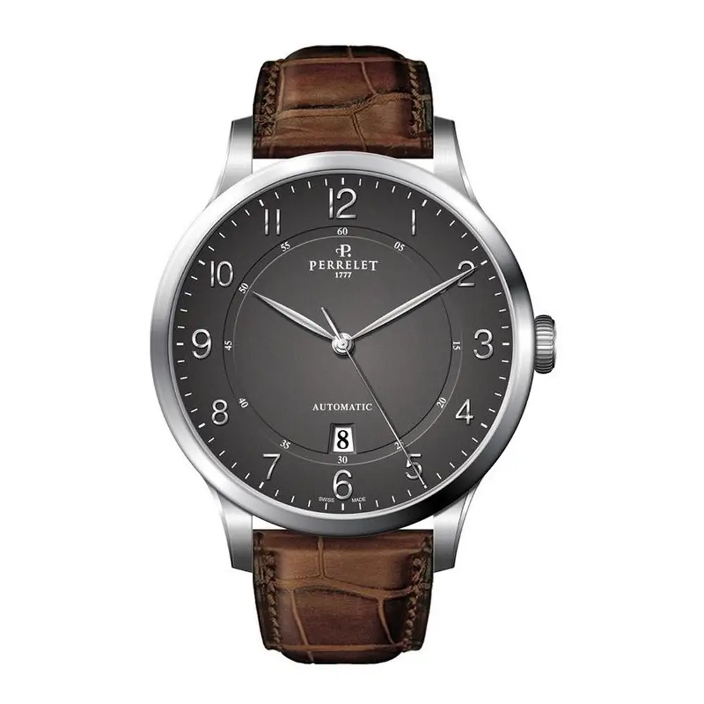 Die Perrelet First Class A1049/6 verkörpern klassische Uhrmacherkunst in ihrer reinsten Form. Das elegante 42,5-mm-Edelstahlgehäuse in Verbindung mit einem klar gestalteten Zifferblatt sorgt für ein zeitloses Design, das sich sowohl für formelle Anlässe als auch für den Alltag eignet. Das dunkle Zifferblatt mit markanten arabischen Ziffern unterstreicht den traditionellen Charakter und gewährleistet optimale Ablesbarkeit.