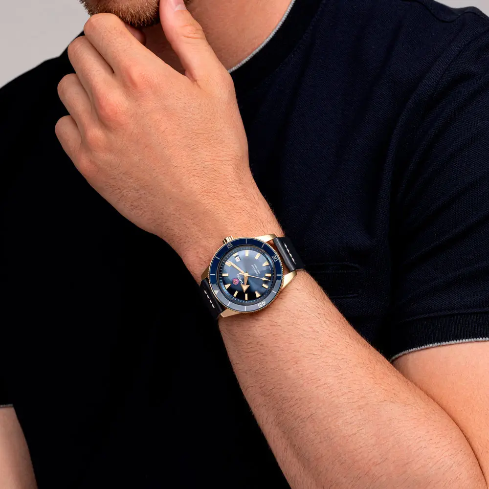 Die Rado Captain Cook Automatic Bronze R32504205 vereint klassisches Taucherdesign mit moderner Schweizer Uhrmacherkunst in einem ausdrucksstarken Bronzegehäuse. Das 42-mm-Gehäuse aus CuAl-Bronze entwickelt im Laufe der Zeit eine natürliche Patina und verleiht jeder Uhr einen einzigartigen Charakter. Das tiefblaue Zifferblatt mit goldfarbenen, leuchtbeschichteten Zeigern und Indizes sowie die drehbare Lünette aus High-Tech-Keramik unterstreichen den sportlich-eleganten Stil.