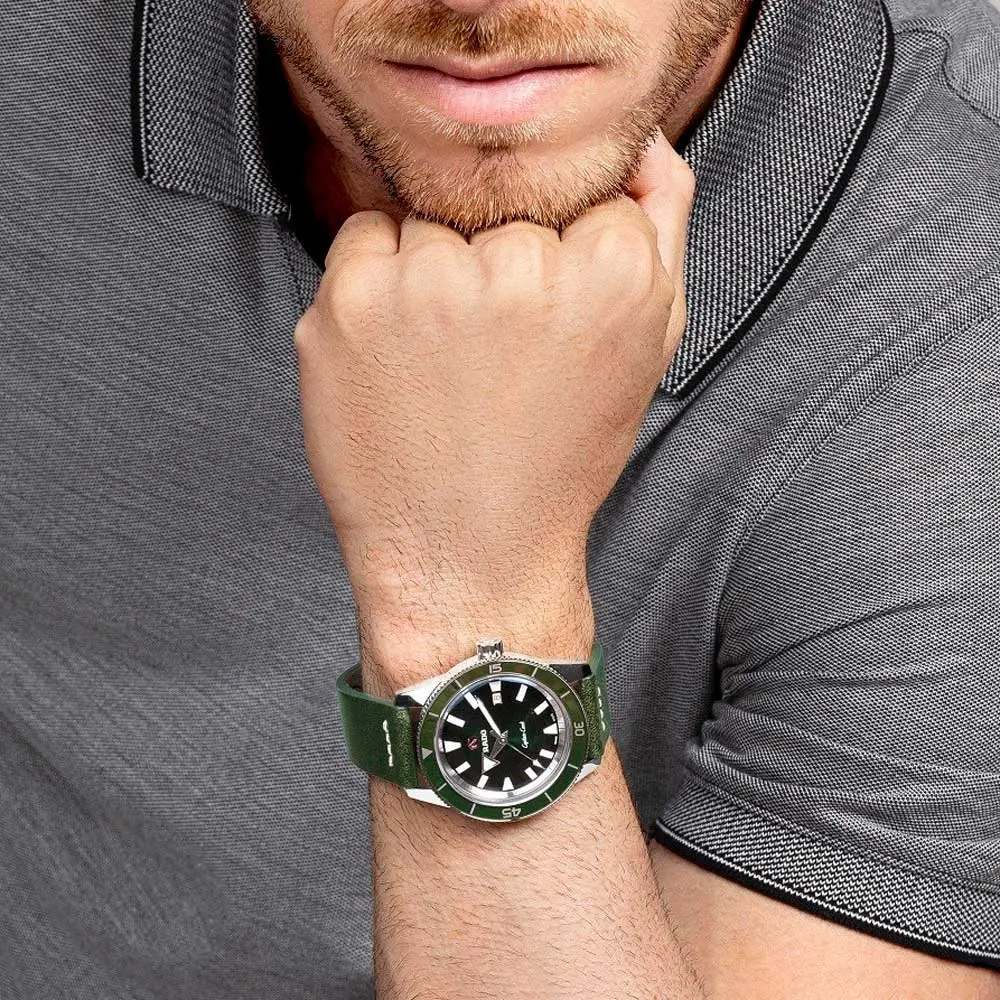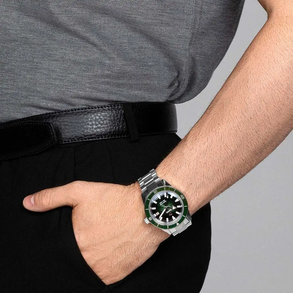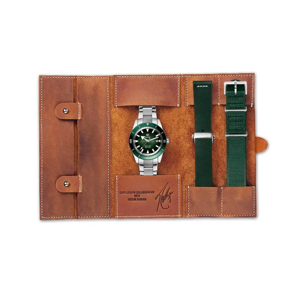 Die Rado Captain Cook Automatic Hrithik Roshan Special Edition R32105319 ist eine besondere Edition der ikonischen Taucheruhr, die in Zusammenarbeit mit Rado-Markenbotschafter und Bollywood-Star Hrithik Roshan entstanden ist. Sie verfügt über ein 42-mm-Edelstahlgehäuse und eine grüne High-Tech-Keramiklünette, die perfekt mit dem eleganten grünen Zifferblatt harmoniert. Leuchtzeiger und -indizes sorgen für beste Ablesbarkeit, während das Saphirglas mit Antireflexbeschichtung optimalen Schutz bietet.