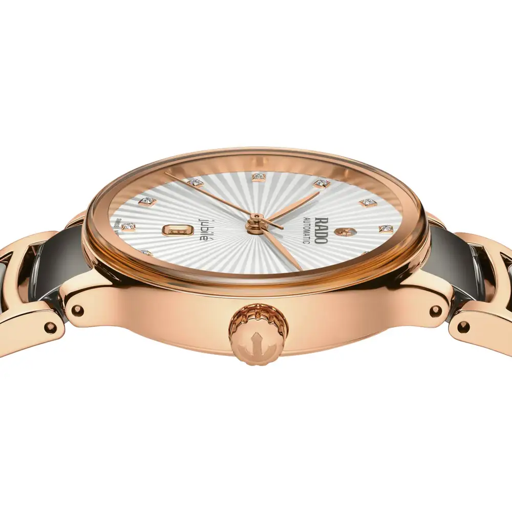 Die Rado Centrix Automatic Diamonds (Ref. R30019742) ist eine luxuriöse Damenuhr, die zeitlose Eleganz mit Schweizer Präzision verbindet. Das 30,5 mm Edelstahlgehäuse mit roségoldfarbener PVD-Beschichtung sorgt für eine edle Optik. Ergänzt wird das Design durch ein gewölbtes Saphirglas mit Entspiegelung und eine ergonomische Gehäuseform. Die Wasserdichtigkeit beträgt 50 m (5 ATM).