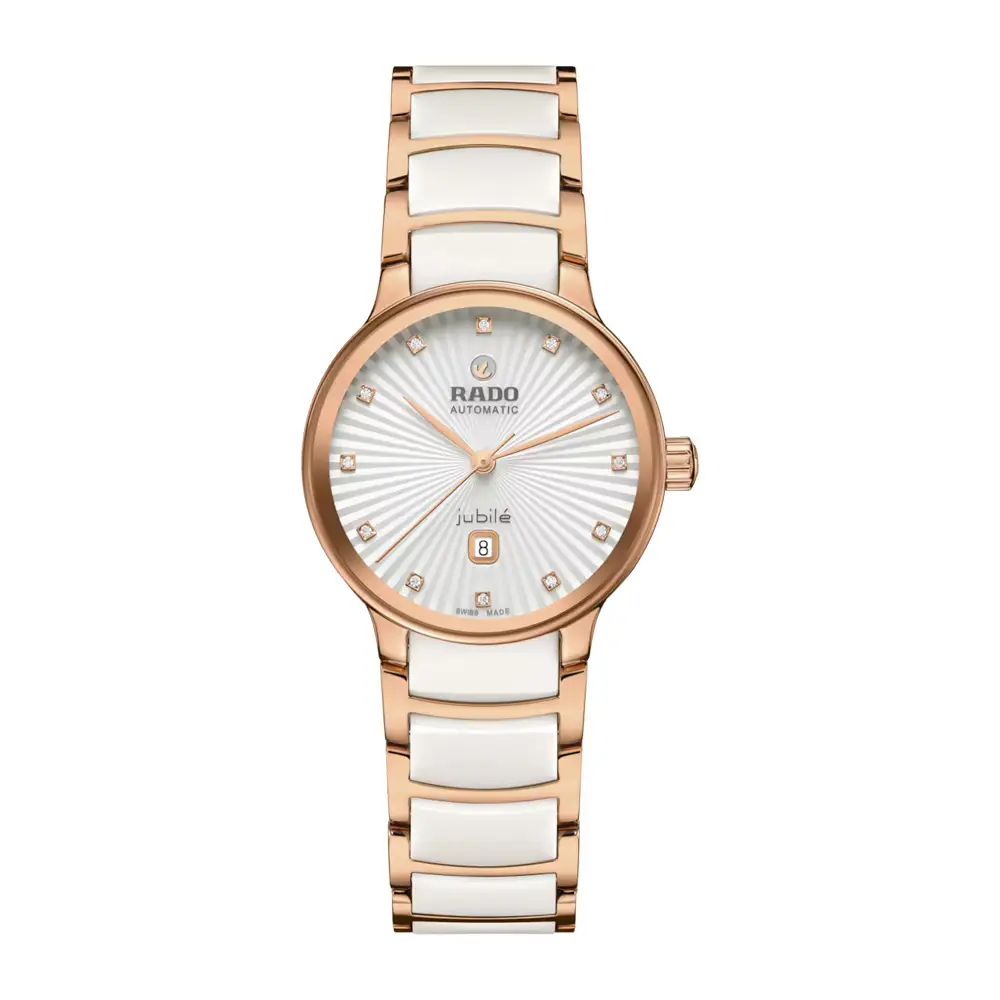 Die Rado Centrix Automatic Diamonds (Ref. R30019744) ist eine luxuriöse Damenuhr, die zeitlose Eleganz mit Schweizer Präzision verbindet. Das 30,5 mm Edelstahlgehäuse mit roségoldfarbener PVD-Beschichtung sorgt für eine edle Optik. Ergänzt wird das Design durch ein gewölbtes Saphirglas mit Entspiegelung und eine ergonomische Gehäuseform. Die Wasserdichtigkeit beträgt 50 m (5 ATM).