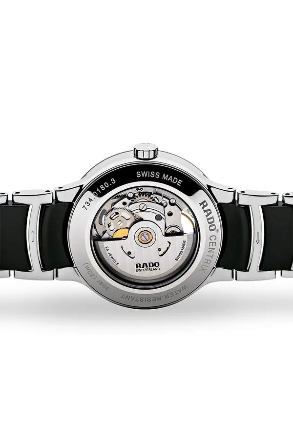 Im Inneren arbeitet das automatische Kaliber Rado R734 mit einer Gangreserve von bis zu 80 Stunden, ausgestattet mit einer antimagnetischen Nivachron™-Spiralfeder für höchste Präzision und Zuverlässigkeit. Durch den transparenten Gehäuseboden lässt sich das fein dekorierte Uhrwerk und der Rotor bewundern – ein Ausdruck echter Schweizer Uhrmacherkunst.