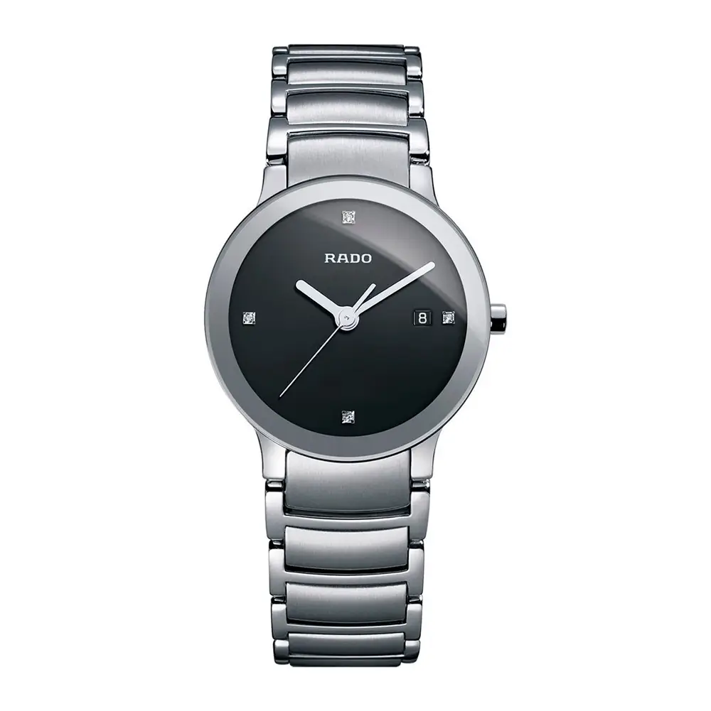 Die Rado Centrix Diamonds R30928713 ist eine elegante Damenuhr, die zeitlosen Stil mit dezentem Luxus vereint. Ihr rundes Edelstahlgehäuse mit einem Durchmesser von 28 mm ist zurückhaltend und ideal für den täglichen Gebrauch sowie besondere Anlässe. Saphirglas sorgt für eine hohe Kratztoleranz und klare Sicht auf das schwarze Zifferblatt, das mit feinen Diamantindizes geschmückt ist.