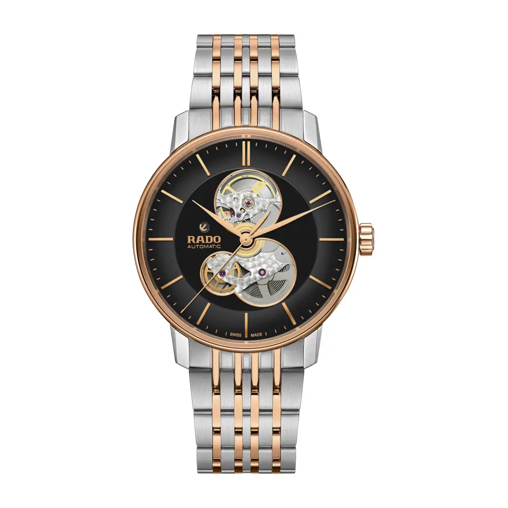 Das zweifarbige Armband aus Edelstahl und roségoldener PVD-Beschichtung harmoniert perfekt mit dem Design und bietet höchsten Tragekomfort. Die Rado Coupole Classic Open Heart R22894163 steht für zeitlose Eleganz, Schweizer Präzision und feine Technik – ideal für Herren, die Tradition und Innovation gleichermaßen schätzen.