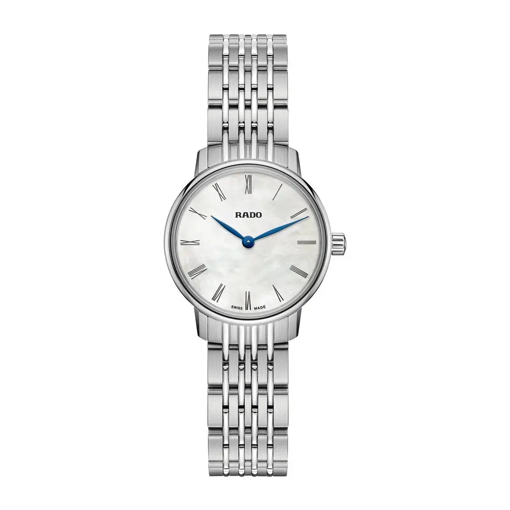 Die Rado Coupole Classic R22897943 steht für zeitlose Eleganz und schlichte Raffinesse. Mit ihrem 27 mm Edelstahlgehäuse und dem polierten Armband bietet sie eine feminine Passform, die jedes Handgelenk elegant betont. Das Perlmuttzifferblatt mit römischen Ziffern verleiht der Uhr eine klassische Note, während das kratzfeste Saphirglas dauerhafte Klarheit gewährleistet.