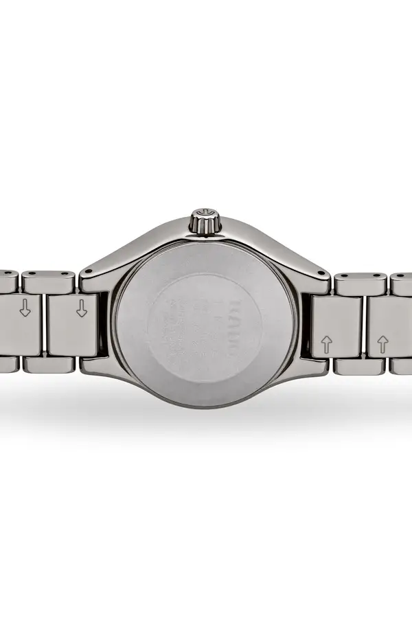 Die Rado True Automatic Diamonds R27243712 vereint auf perfekte Weise Juwelen-Eleganz und Schweizer Uhrmacherkunst. Ihr elegantes 30-mm-Gehäuse aus Plasma-High-Tech-Keramik mit Titan-Details glänzt in einem metallischen Schimmer und ist zugleich leicht und kratzfest. Das silbergraue Zifferblatt mit zwölf Diamanten als Stundenmarkierungen verleiht der Uhr eine feminine und luxuriöse Ausstrahlung. Das Saphirglas mit Antireflexbeschichtung sorgt für klare Sicht und optimalen Schutz.