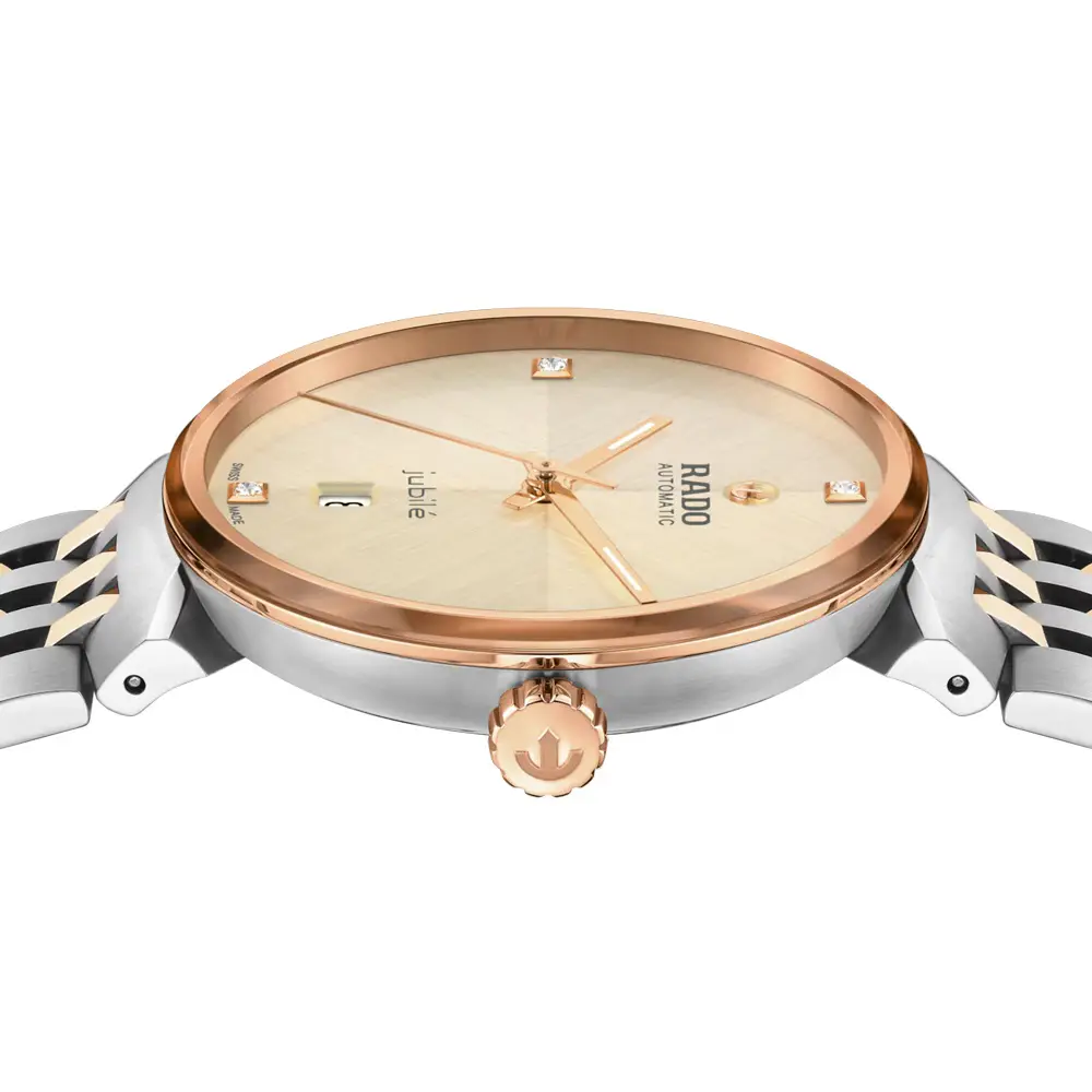 Elegante automatische Damenuhr, die zeitlose Feinheit mit präziser Schweizer Mechanik verbindet. Die Rado Florence Automatic R48903703 besticht durch ein champagnerfarbenes Zifferblatt mit vier Diamanten, die ihren luxuriösen Charakter unterstreichen. Die roségoldfarbene Lünette und die Kombination aus matten und polierten Stahlelementen sorgen für einen anspruchsvollen Look – ideal für Büro und Abendveranstaltungen.