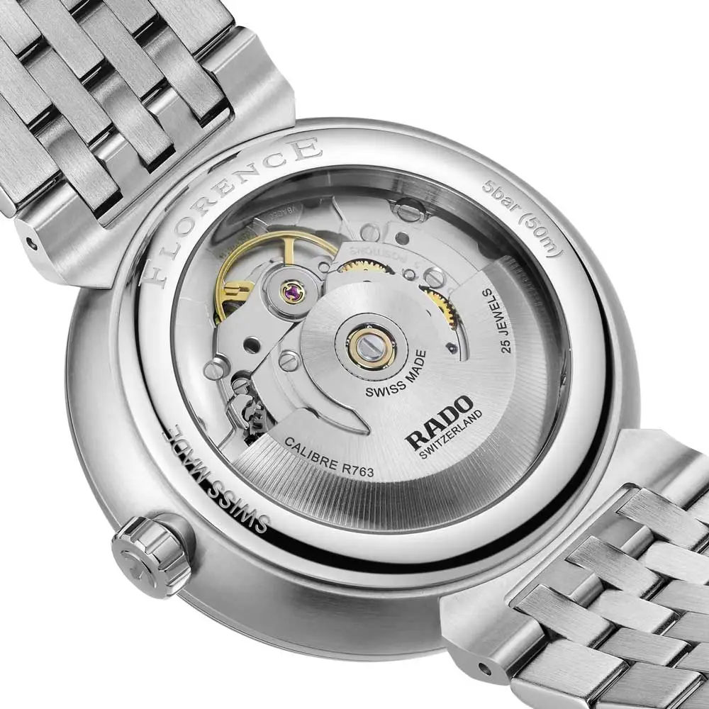 Die Rado Florence Automatic R48903153 verkörpert eine harmonische Verbindung klassischer Ästhetik und moderner Uhrmacherkunst. Das runde 39-mm-Gehäuse besteht aus hochwertigem Edelstahl, der sowohl Robustheit als auch ein elegantes Erscheinungsbild garantiert.