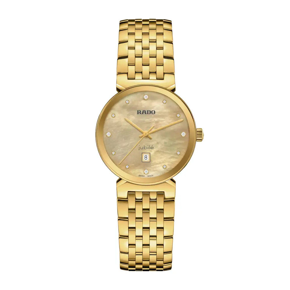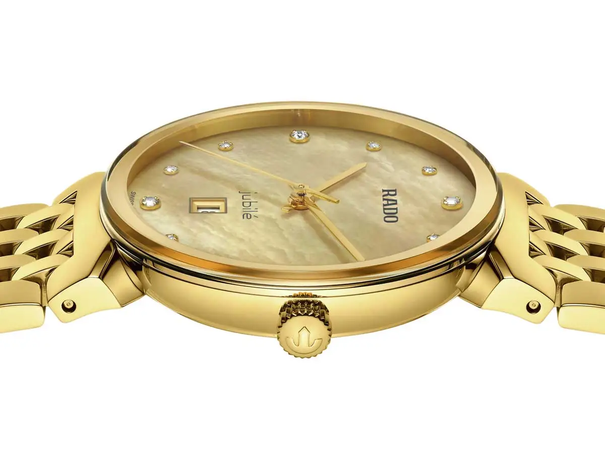 Die Rado Florence Diamonds R48915903 vereint Eleganz, feminine Ausstrahlung und Schweizer Präzision in vollkommener Harmonie. Das 30 mm Edelstahlgehäuse mit gelber PVD-Beschichtung geht nahtlos in das passende Edelstahlarmband über und schafft ein stilvolles Gesamtbild. Das Perlmuttzifferblatt mit 12 Diamanten verleiht der Uhr einen luxuriösen und eleganten Charakter, während das facettierte Saphirglas für hervorragende Ablesbarkeit und Kratzfestigkeit sorgt.