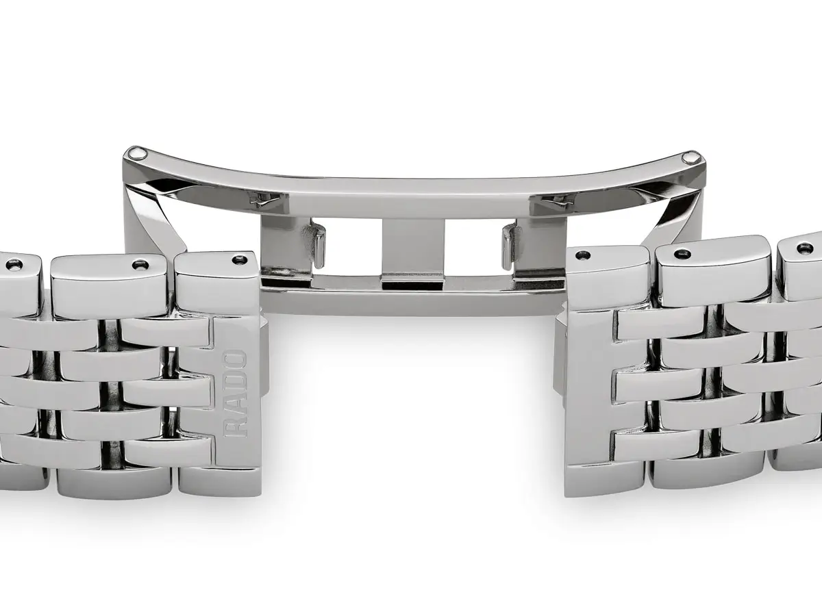 Das weiße Perlmuttzifferblatt ist mit zwölf Diamantindizes besetzt, während goldfarbene Zeiger und das Rado-Logo unter dem Saphirglas in edlem Glanz erstrahlen. Das Schweizer Quarzkaliber R079 sorgt für höchste Zuverlässigkeit und Präzision bei minimalem Wartungsaufwand.