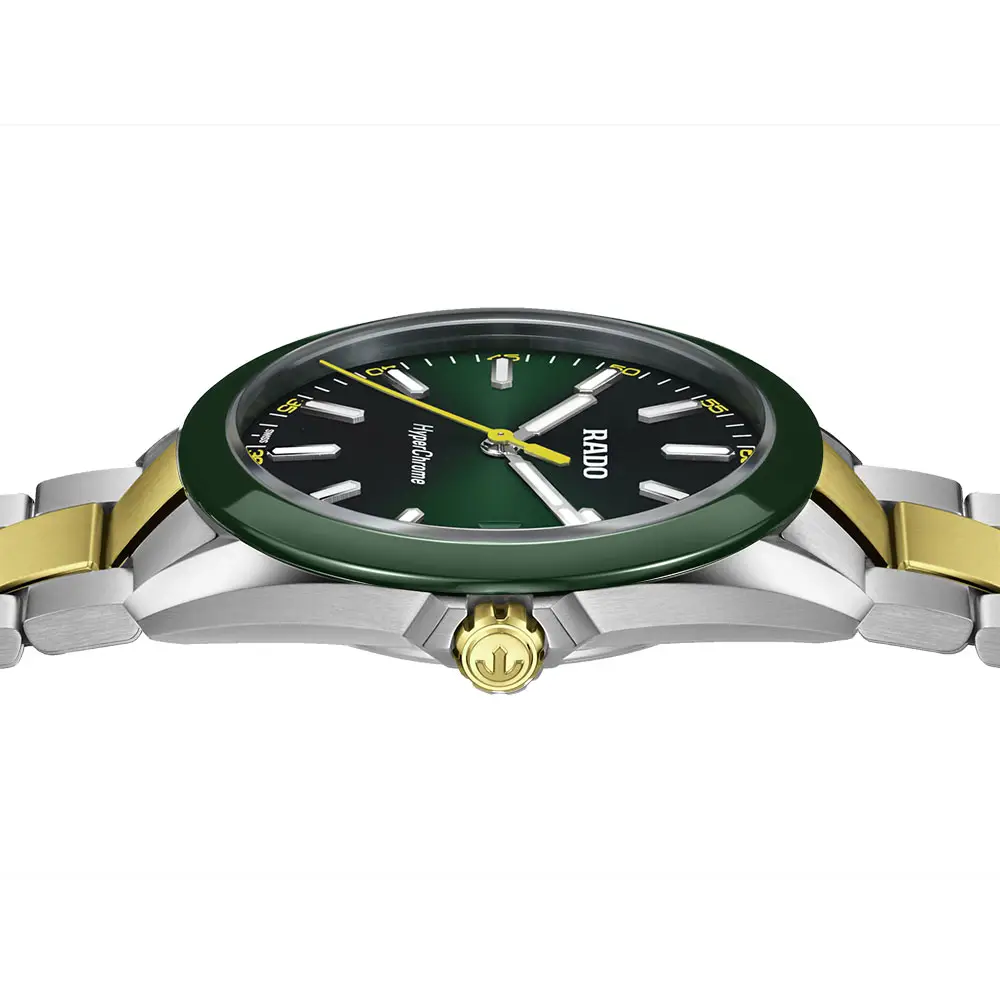 Im Inneren arbeitet das Quarzwerk Rado Kaliber R292 mit PreciDrive- und HeavyDrive-Technologie, das eine außergewöhnliche Genauigkeit von ±10 Sekunden pro Jahr gewährleistet. Die Uhr ist bis 150 m wasserdicht und wird mit einem zweifarbigen Edelstahlarmband mit PVD-Beschichtung geliefert, das über eine dreifache Faltschließe mit Schnellverstellung verfügt. Die HyperChrome ist die perfekte Wahl für alle, die eine stilvolle und langlebige Uhr für Alltag und aktive Momente suchen.