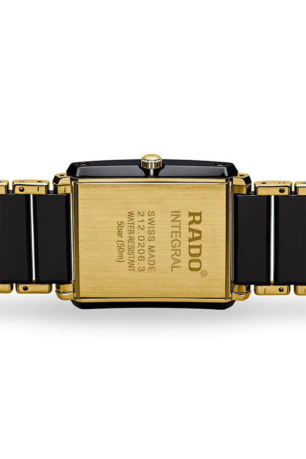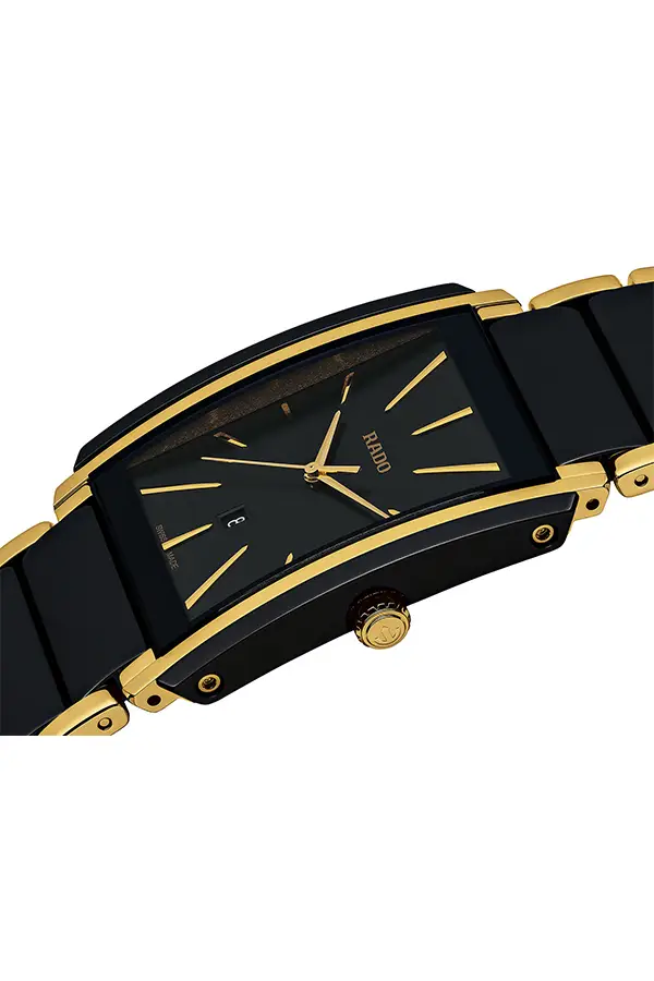 Die Integral R20204162 ist ein ikonisches Modell, das modernen Minimalismus mit luxuriösen Details verbindet. Das rechteckige Gehäuse (31 × 41 mm) aus einer Kombination von Keramik, Edelstahl und gelber Vergoldung wird durch ein widerstandsfähiges Saphirglas geschützt, das langanhaltenden Glanz ohne Kratzer garantiert. Das elegante schwarze Zifferblatt wird durch eine praktische Datumsanzeige bei 3 Uhr ergänzt, was die Funktionalität des Modells unterstreicht.