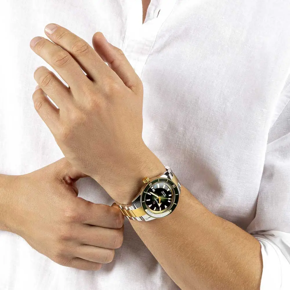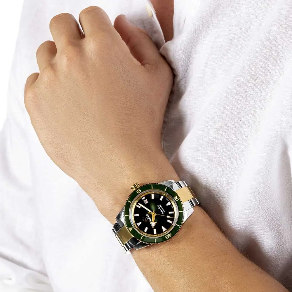 Der grüne analoge Zifferblatt mit markanten Zeigern und Indizes wird durch ein kratzfestes Saphirglas geschützt. Die einseitig drehbare grüne Keramiklünette betont den Tauchercharakter und verleiht dem Modell eine moderne Note.