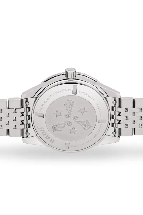 Im Inneren arbeitet das automatische Kaliber Rado R763 mit einer Gangreserve von bis zu 80 Stunden, das höchste Präzision und Zuverlässigkeit garantiert. Die Uhr zeigt Stunden, Minuten, Sekunden sowie das Datum bei 3 Uhr an. Dank der Wasserdichtigkeit bis 200 m (20 ATM) eignet sie sich ideal zum Schwimmen und leichten Tauchen.