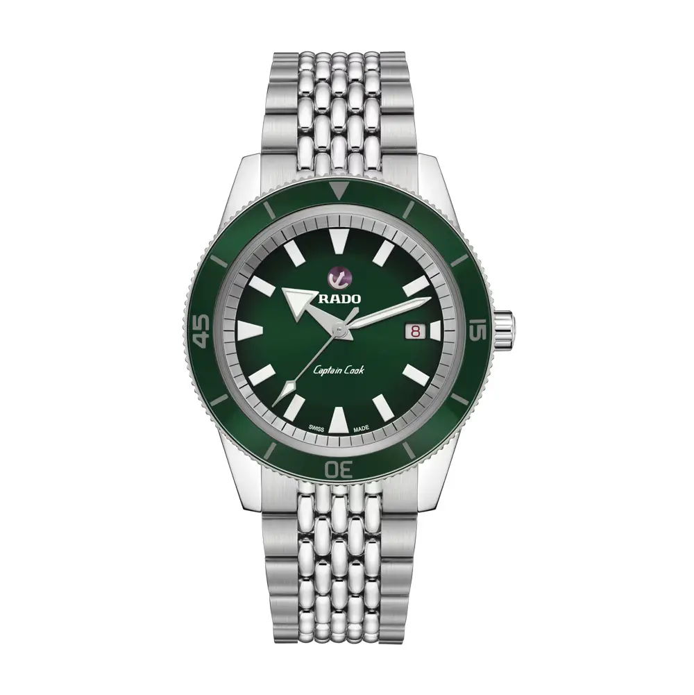 Die Rado Captain Cook Automatic R32505313 lässt das ikonische Design der 1960er Jahre in moderner Form wieder aufleben und vereint abenteuerlichen Stil mit Schweizer Präzision. Das 42-mm-Edelstahlgehäuse wird durch eine beidseitig drehbare Lünette mit grüner High-Tech-Keramikeinlage ergänzt, die perfekt mit dem tiefgrünen Zifferblatt harmoniert. Leuchtzeiger und -indizes sorgen für beste Ablesbarkeit, geschützt durch ein Saphirglas mit Antireflexbeschichtung.