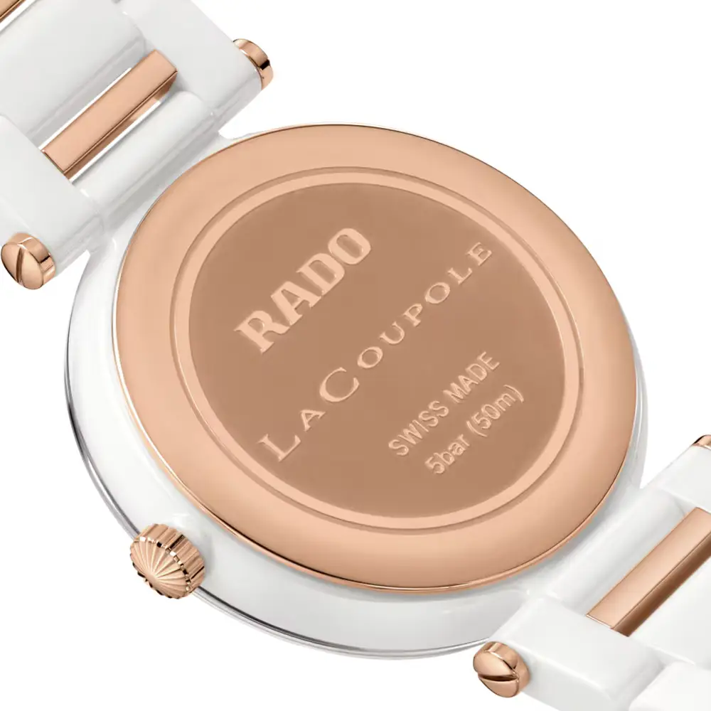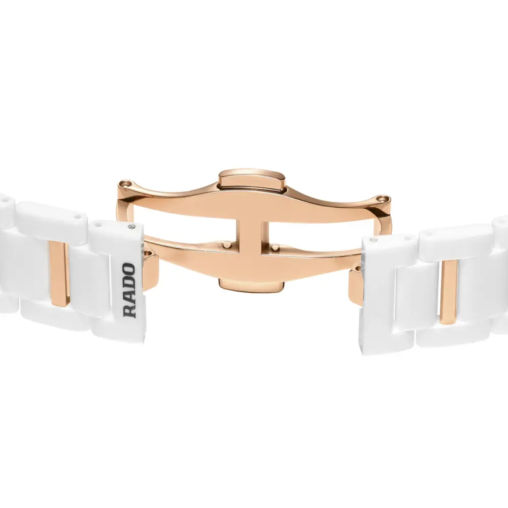 Das silberfarbene Zifferblatt ist mit zwölf Brillant-Indexen besetzt, die unter dem kratzfesten Saphirglas bei jeder Bewegung funkeln. Der elegante Kontrast zwischen weißer Keramik und roségoldenen Akzenten betont den femininen Stil der Uhr, während die feinen Zeiger den unverwechselbaren Rado-Charakter widerspiegeln.